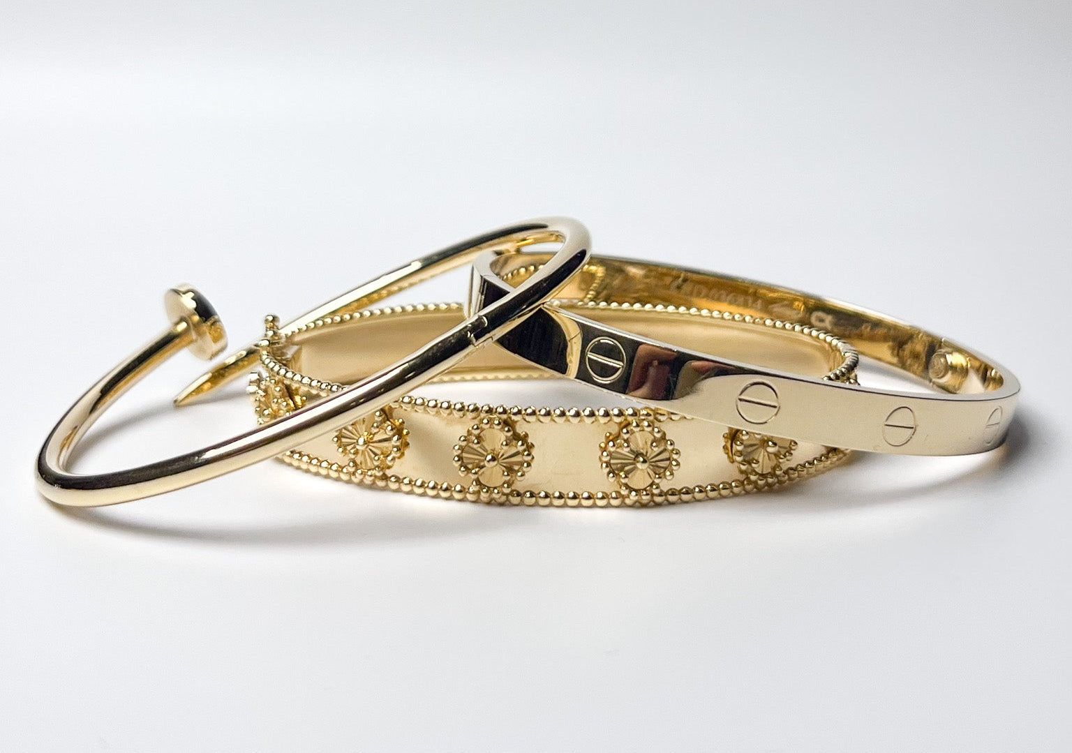 All of our jewelry is 18 karat solid gold, the most luxurious purity of gold for everyday wear.